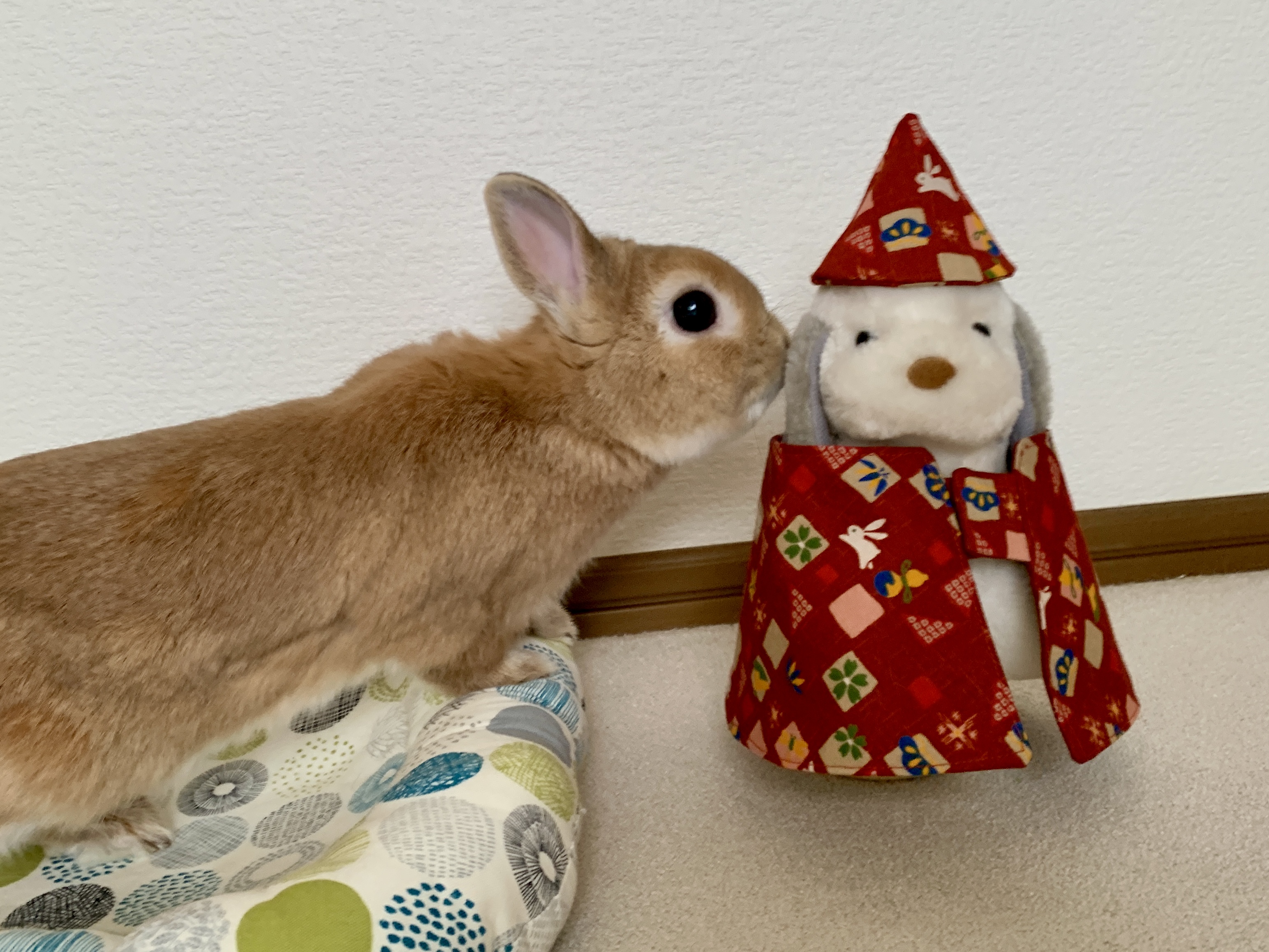 予想通り愛兎は着てくれなかったので、一旦ぬいぐるみに着せてみました。